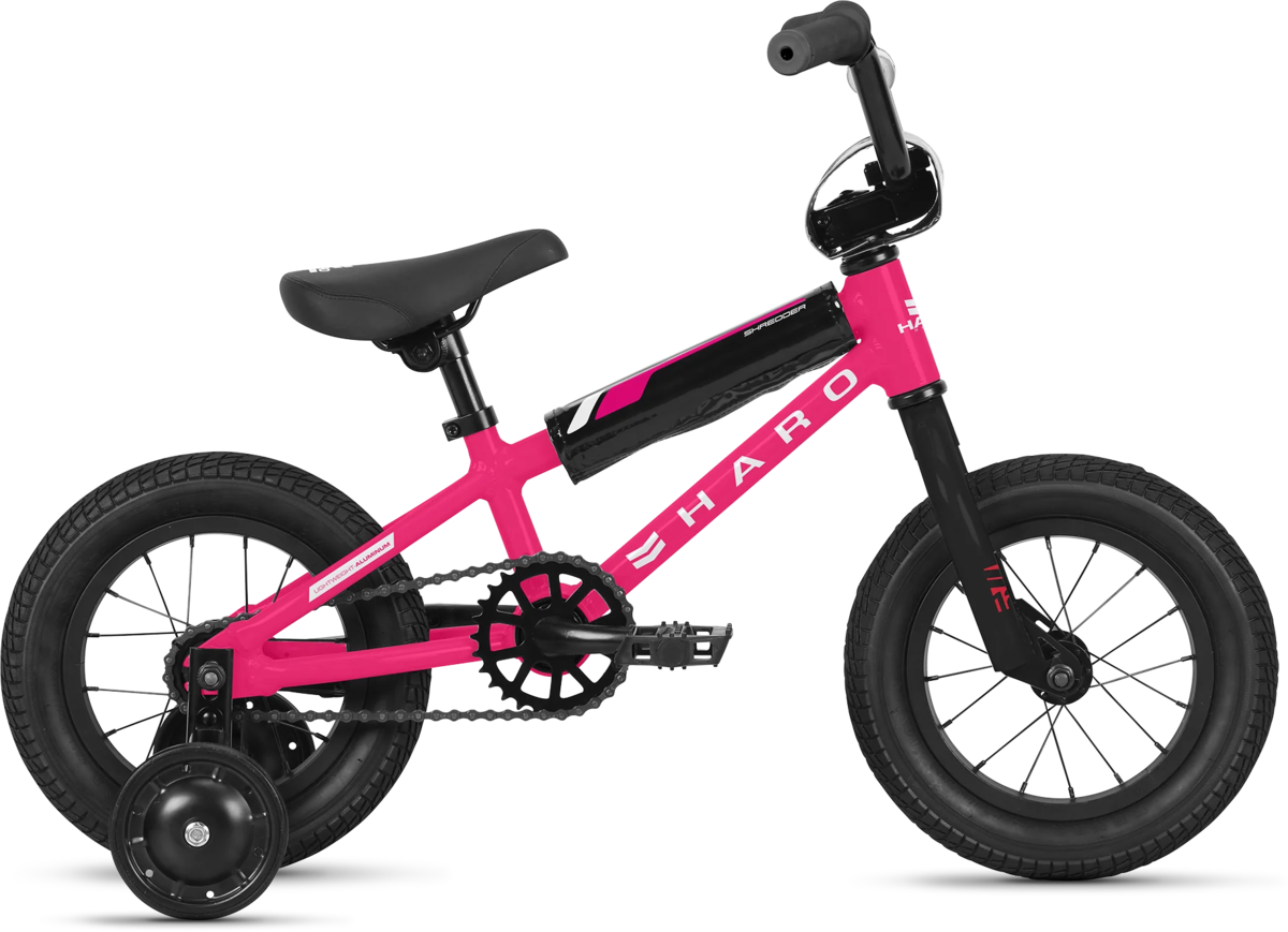 There's nothing quite like the feeling of riding your first pedal bike and the Haro Shredder 12 is where it all starts. Transitioning from a Haro PreWheelz balance bike to the Shredder 12 is made easy with features like the low profile light weight aluminum frame and rear coaster brake which provide confidence and ease of control to riders new to pedal bikes. The alloy rim wheels and 1 1/8" threadless headset are durable and built to stand the test of time. The Shredder 12 also includes a full pad set and heavy duty training wheels for those who may need an additional stepping stone making the transition to a pedal bike.